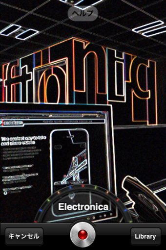Socialcam Video Cameraでは、最初にFacebookやTwitter、メールアドレスなどのアカウントを登録する必要があります。その後トップ画面で下部の撮影ボタンをタップします。撮影を開始する前に、映像に各種効果を加えるフィルターを選択することができます。フィルターなしの状態から、画面を横にフリックしていくと、ちらつきの入った1970年代風やネガポジ反転したネオンサインのようなElectronica、暗めの白黒映像などのフィルターが用意されています。